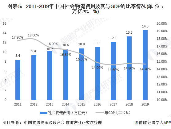 2019年,我國社會物流總費用為14.6萬億元,與GDP比率為14.7%,較2011年下降3.1個百分點,結(jié)合長期以來我國GDP總量的較大規(guī)模來看,現(xiàn)階段我國物流成本控制力度較以往有明顯提高,物流效率有所提升。