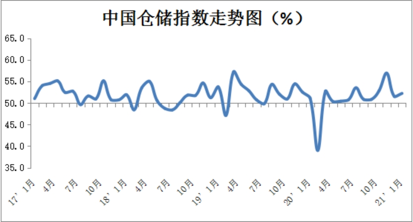 中國(guó)物流與采購(gòu)聯(lián)合會(huì)發(fā)布的2021年1月份中國(guó)物流業(yè)景氣指數(shù)為54.4%較上月回落2.5個(gè)百分點(diǎn);中國(guó)倉(cāng)儲(chǔ)指數(shù)為52.2%,較上月回升0.7個(gè)百分點(diǎn)。