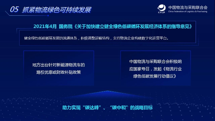 今年4月,國(guó)務(wù)院《關(guān)于加快建立健全綠色低碳循環(huán)發(fā)展經(jīng)濟(jì)體系的指導(dǎo)意見》。文件指出要健全綠色低碳循環(huán)發(fā)展的流通體系,積極調(diào)整運(yùn)輸結(jié)構(gòu),支持物流企業(yè)構(gòu)建數(shù)字化運(yùn)營(yíng)平臺(tái)。北京、天津、深圳、廣州、成都等城市也紛紛出臺(tái)了針對(duì)新能源物流車的路權(quán)優(yōu)惠或財(cái)政補(bǔ)貼政策。最近,中國(guó)物流與采購(gòu)聯(lián)合會(huì)也積極響應(yīng)國(guó)家號(hào)召,發(fā)起了《物流行業(yè)綠色低碳發(fā)展行動(dòng)倡議》,共同推動(dòng)我國(guó)物流業(yè)踐行國(guó)家綠色發(fā)展理念,助力實(shí)現(xiàn)“碳達(dá)峰”、“碳中和”的戰(zhàn)略目標(biāo)。
