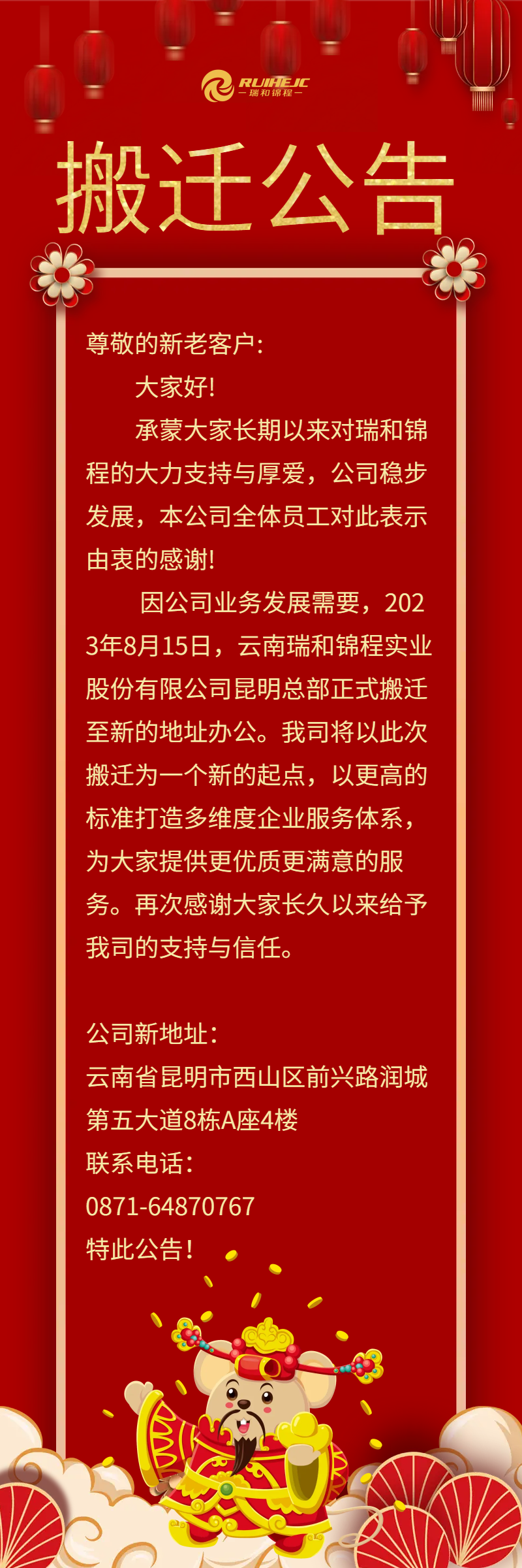 新聞動態(tài) 業(yè)務(wù)推介 黨建工會 電子刊物 公示公告 首頁 > 企業(yè)資訊 > 公示公告 搬遷公告 來源:瑞和錦程 瀏覽量:7159 日期:2023-08-15 下一篇:瑞和錦程關(guān)于申報首屆“云嶺慈善獎”的公示