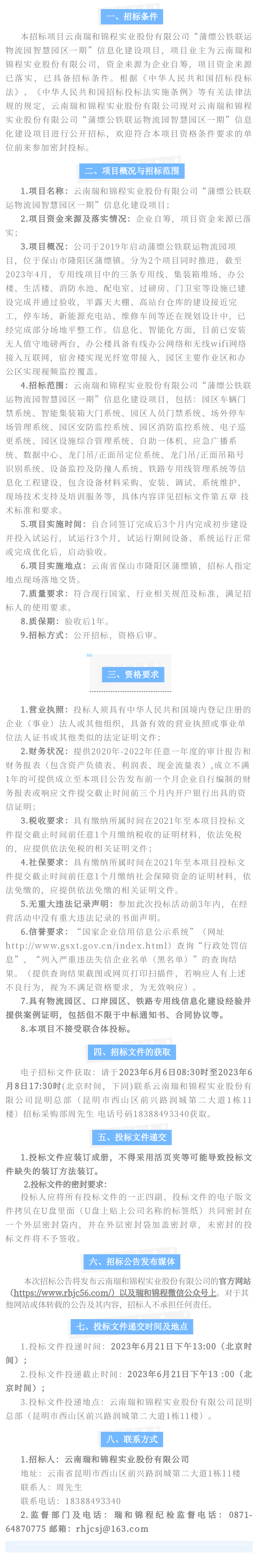 新聞動態(tài) 業(yè)務(wù)推介 黨建工會 電子刊物 公示公告 首頁 > 企業(yè)資訊 > 公示公告 云南瑞和錦程實業(yè)股份有限公司“蒲縹公鐵聯(lián)運(yùn)物流園智慧園區(qū)一期”信息化建設(shè)項目招標(biāo)公告 來源:瑞和錦程 瀏覽量:6246 日期:2023-06-06 上一篇:蒲縹公鐵聯(lián)運(yùn)物流園智慧園區(qū)一期建設(shè)項目招標(biāo)中標(biāo)結(jié)果公告